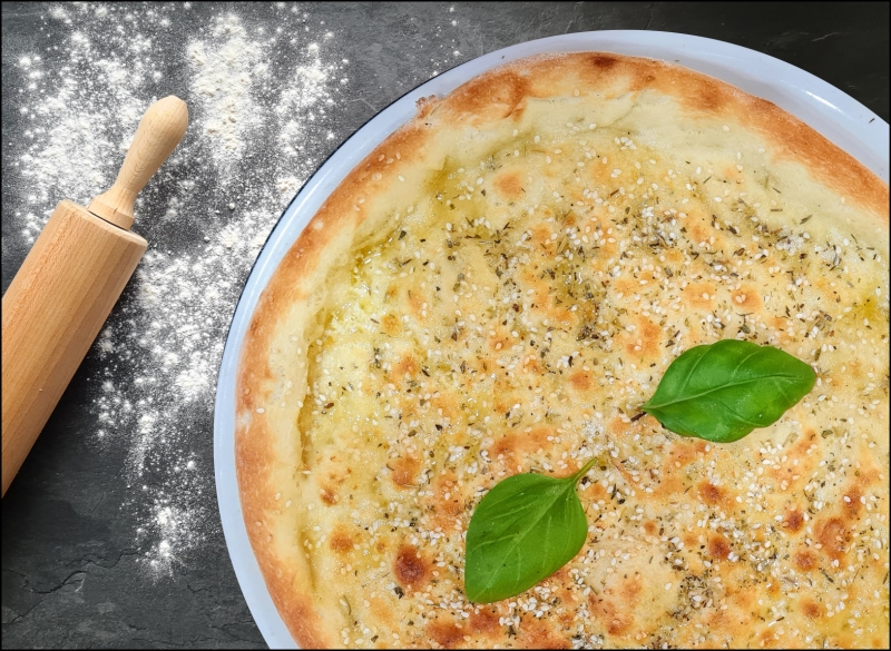 Pizza WE,MI mit Olivenöl, Knoblauch, Sesam und Gewürze