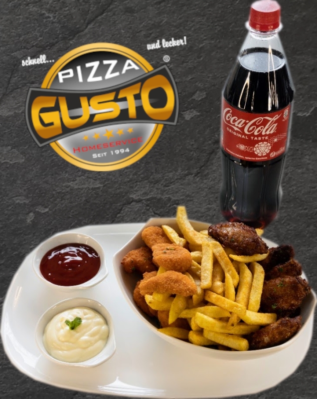 5 Nuggets, 5 Hot Chicken Wing, eine Portion Pommes, Dip nach Wahl WE,EI,SN,SO,SF und ein Cola-Cola Ltr.