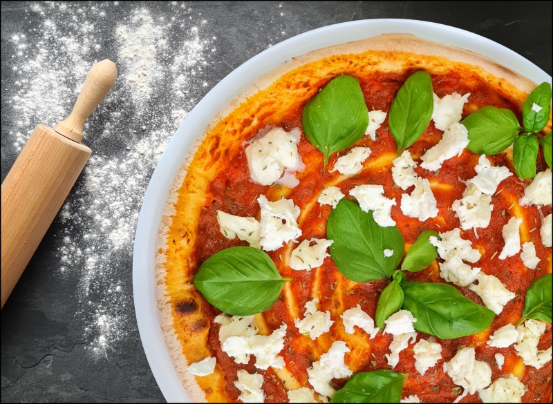 Pizza WE,MI  Tomatensoße, fr. Mozzarella MI, fr. Basilikum