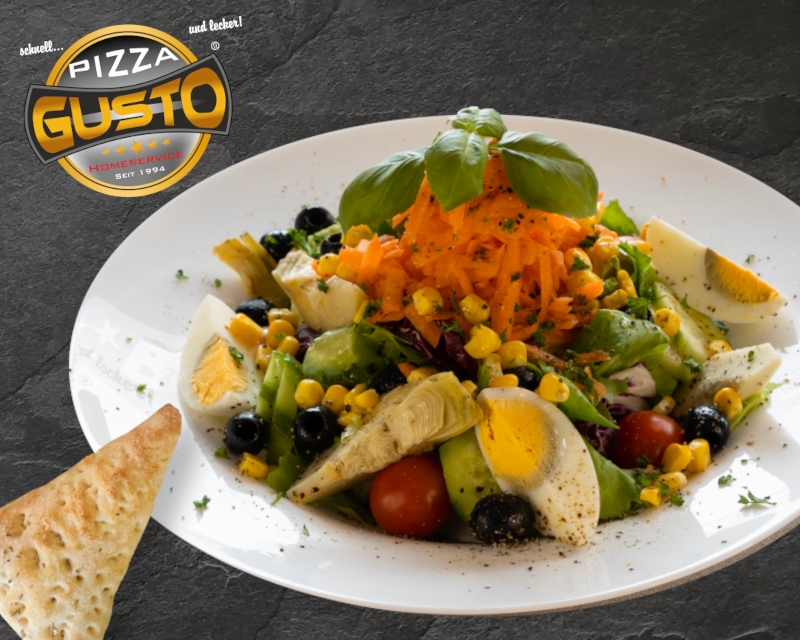 grüner Salat, frische Tomaten, Gurken, Karotten, Mais, Artischocken, Oliven und Ei